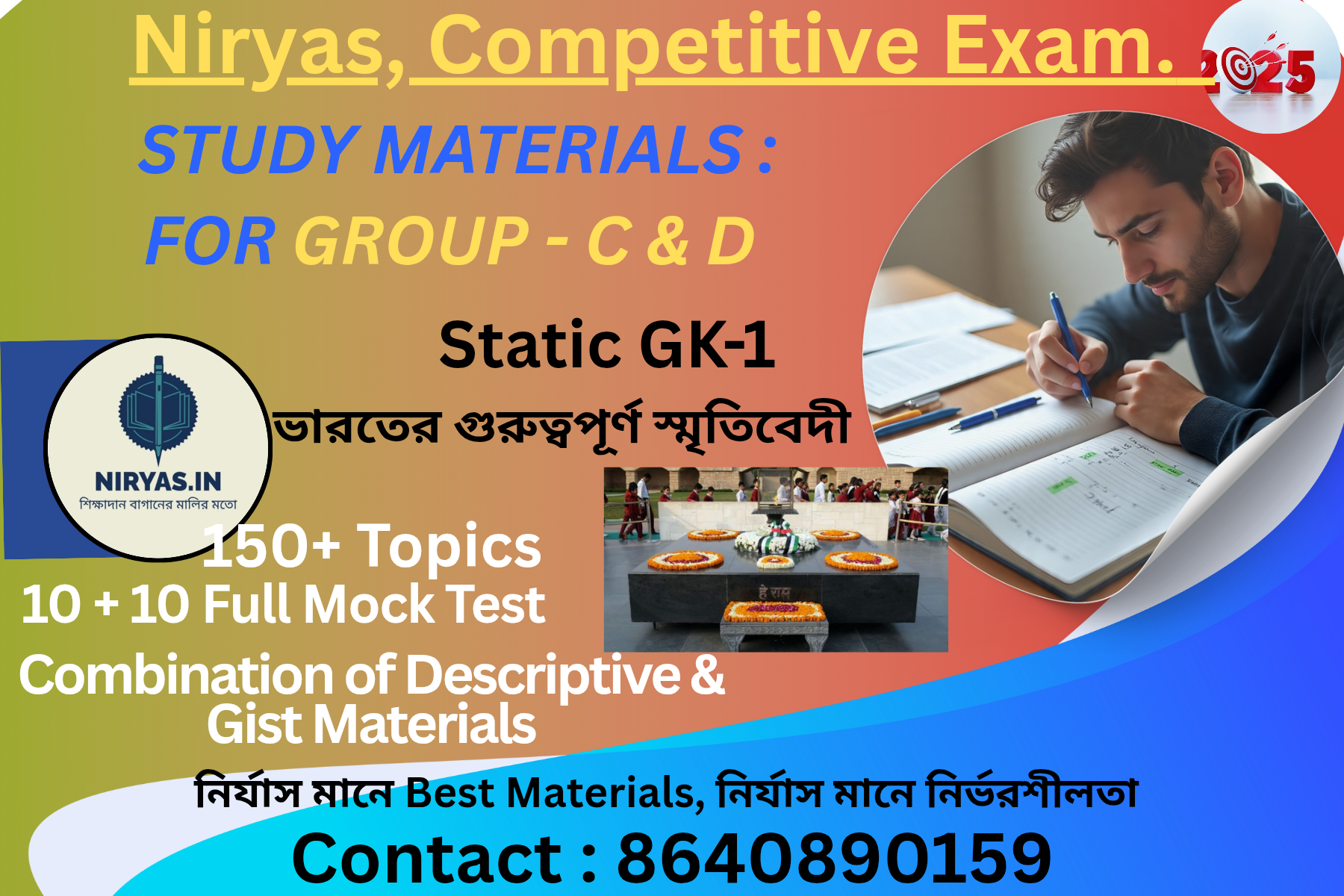 দীর্ঘদিন পর WBSSC আয়োজন করতে চলেছে WBSSC Group-C&D এর পরীক্ষা । অষ্টম শ্রেণী ও মাধ্যমিক যোগ্যতার এই পরীক্ষায় বেশ কয়েক লক্ষ (20+) পরীক্ষার্থী অংশগ্রহণ করবে । আগামি কয়েক বছর আর হয়তো এরূপ পরীক্ষা হওয়ার সম্ভাবনা প্রায় নেই । তাই প্রতিটি প্রতিযোগী এই পরীক্ষায় আপ্রাণ লড়াই করবে । তোমরা যারা একেবারেই সিরিয়াসভাবে প্রস্তুতি চালিয়ে যাবে তারাই টিকে থাকতে সক্ষম হবে । তোমাদের সাহায্যের জন্য আমরাও আপ্রাণ চেষ্টা চালিয়ে যাচ্ছি । তার নমুনাস্বরূপ Important Memorials of India GK-1 নামক পোস্টে ভারতের স্মৃতিবেদী সম্পর্কিত গুরুত্বপূর্ণ তথ্য উপস্থিত করলাম । নিয়মিত আপডেট থাকতে আমাদের সঙ্গে থেকে প্রস্তুতি চালিয়ে যাও ।