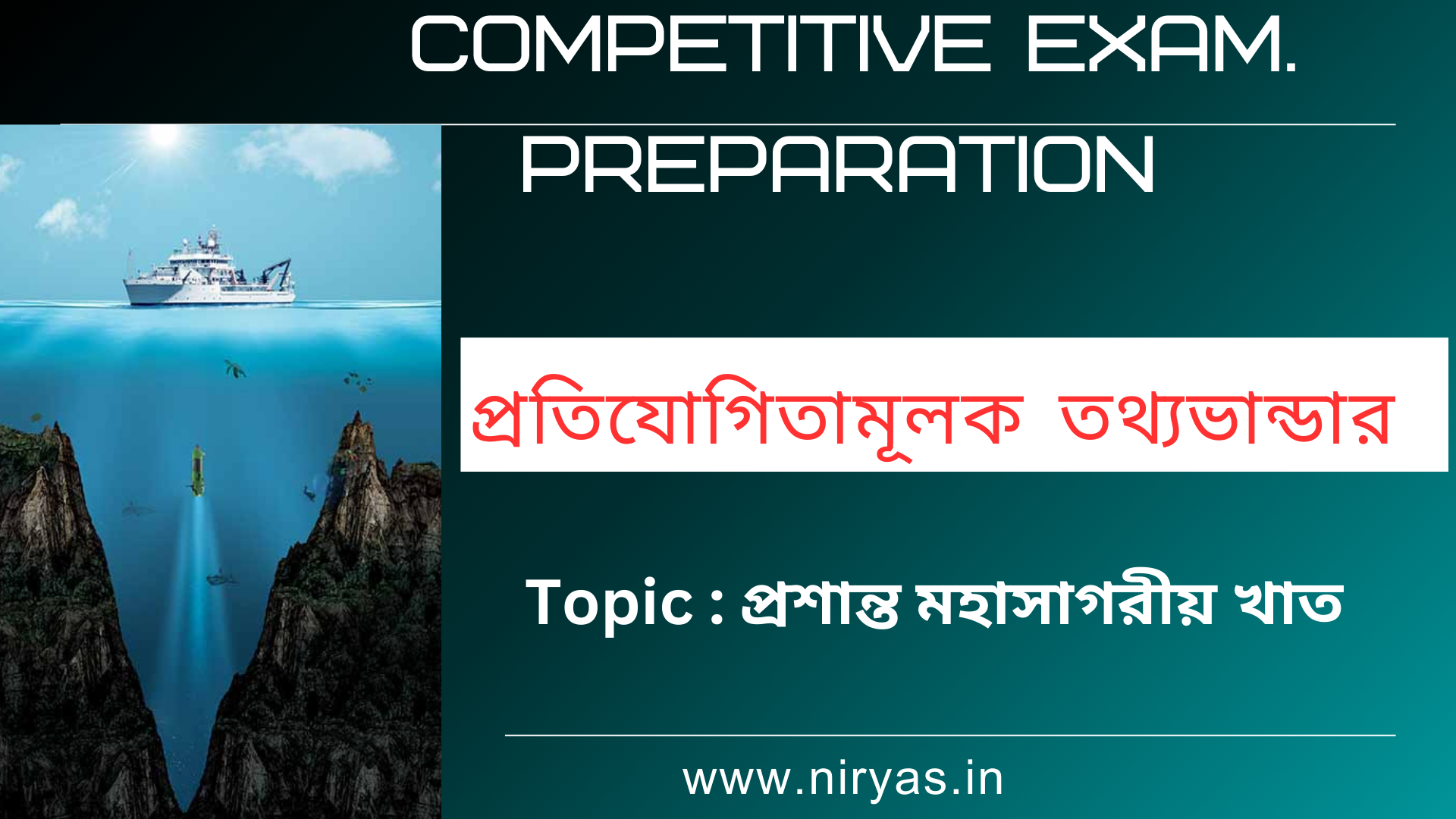 www.niryas.in এ আপনাকে স্বাগত । প্রতিযোগিতামূলক পরীক্ষার ক্ষেত্রে প্রতিযোগী শিক্ষার্থীদের সাহায্য করে বিভিন্ন বিষয়ের সংক্ষিপ্ত তথ্য । এক্ষেত্রে অসংখ্য বিষয়বস্তু থাকলেও বেশকিছু বিষয়ের টু দি পয়েন্ট তথ্য সমন্ধে সাম্যক ধারণা প্রতিযোগী শিক্ষার্থীদের অনেকটাই এগিয়ে রাখে । এরকম কিছু বিষয়বস্তুর ভিত্তিতে আমরা উপস্থাপন করেছি প্রতিযোগিতামূলক পরীক্ষা প্রস্তুতি বিভাগের প্রতিযোগিতামূলক তথ্য ভান্ডার উপ-বিভাগটি । এই উপ-বিভাগে Pacific Ocean Trenches নামক পোস্টে এখন আমরা আলোচনা করবো প্রশান্ত মহাসাগরে অবস্থিত 20টি গুরুত্বপূর্ণ খাত সংক্রান্ত বেশ কিছু সংক্ষিপ্ত তথ্য । তাহলে চলুন এক নজরে দেখে নিই তথ্যগুলি । ⬎