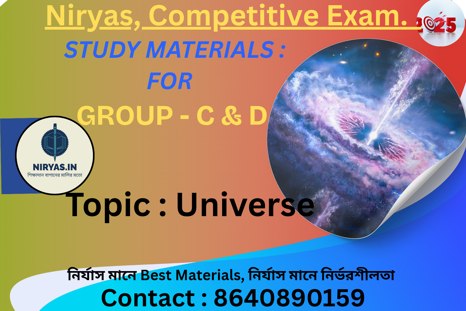 দীর্ঘদিন পর WBSSC আয়োজন করতে চলেছে WBSSC Group-C&D এর পরীক্ষা । এর জন্য আগামি 03/11/2025 থেকে শুরু হবে আবেদন গ্রহণ, যা চলবে 03/12/25 পর্যন্ত । অষ্টম শ্রেণী ও মাধ্যমিক যোগ্যতার এই পরীক্ষায় বেশ কয়েক লক্ষ (20+) পরীক্ষার্থী অংশগ্রহণ করবে । আগামি কয়েক বছর আর হয়তো এরূপ পরীক্ষা হওয়ার সম্ভাবনা প্রায় নেই । তাই প্রতিটি প্রতিযোগী এই পরীক্ষায় আপ্রাণ লড়াই করবে । তোমরা যারা একেবারেই সিরিয়াসভাবে প্রস্তুতি চালিয়ে যাবে তারাই টিকে থাকতে সক্ষম হবে । তোমাদের সাহায্যের জন্য আমরাও আপ্রাণ চেষ্টা চালিয়ে যাচ্ছি । তার নমুনাস্বরূপ WBSSC Group-C&D Study Materials GK Universe নামক পোস্টে মহাবিশ্ব সংক্রান্ত বেশকিছু গুরুত্বপূর্ণ তথ্য উপস্থিত করলাম । এই অংশ থেকে প্রায়শই দু’ – একটি প্রশ্ন এসেই থাকে । নিয়মিত আপডেট থাকতে আমাদের সঙ্গে থেকে প্রস্তুতি চালিয়ে যাও । ➣ Join : Our Telegram Channel